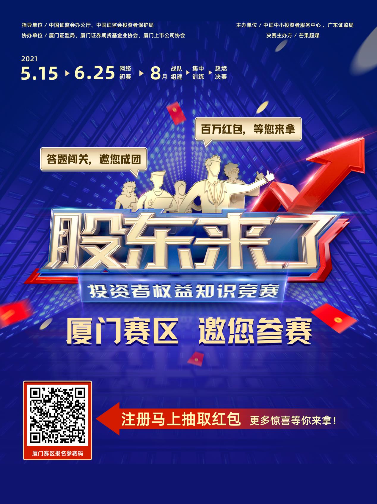 2021年是“十四五”規(guī)劃開局之年,為進一步落實證監(jiān)會黨委關于資本市場人民性要求和保護投資者合法權益的職責,在會辦公廳、投保局指導下,投服中心將聯(lián)合廣東、四川、湖北、內蒙古、海南、西藏六證監(jiān)局共同舉辦《股東來了》2021投資者權益知識競賽,面向廣大中小投資者普及權益知識,示范引領全面知權、積極行權、依法維權。